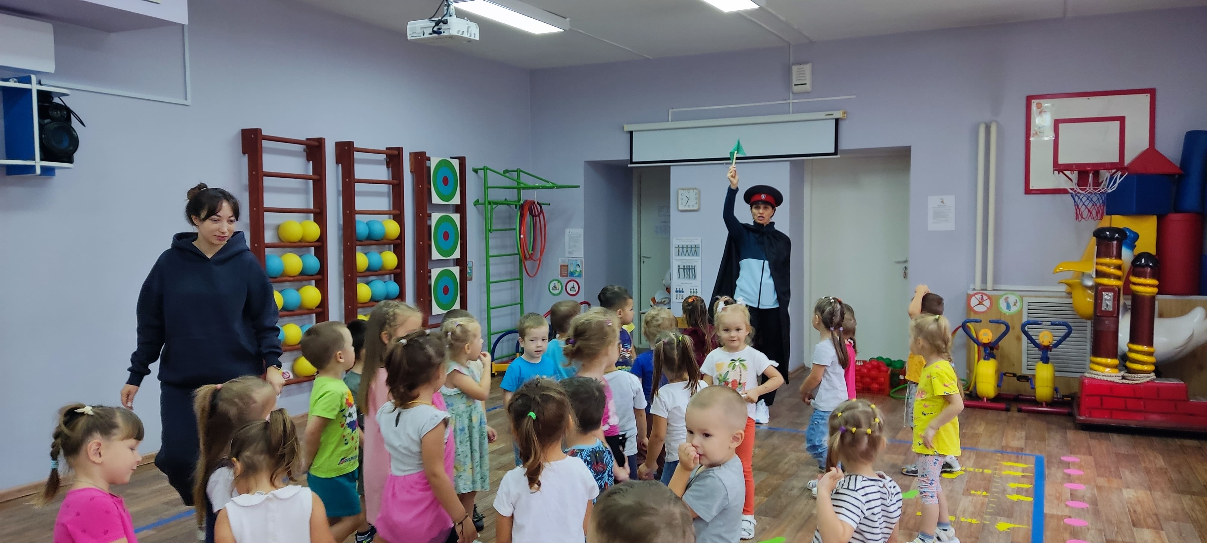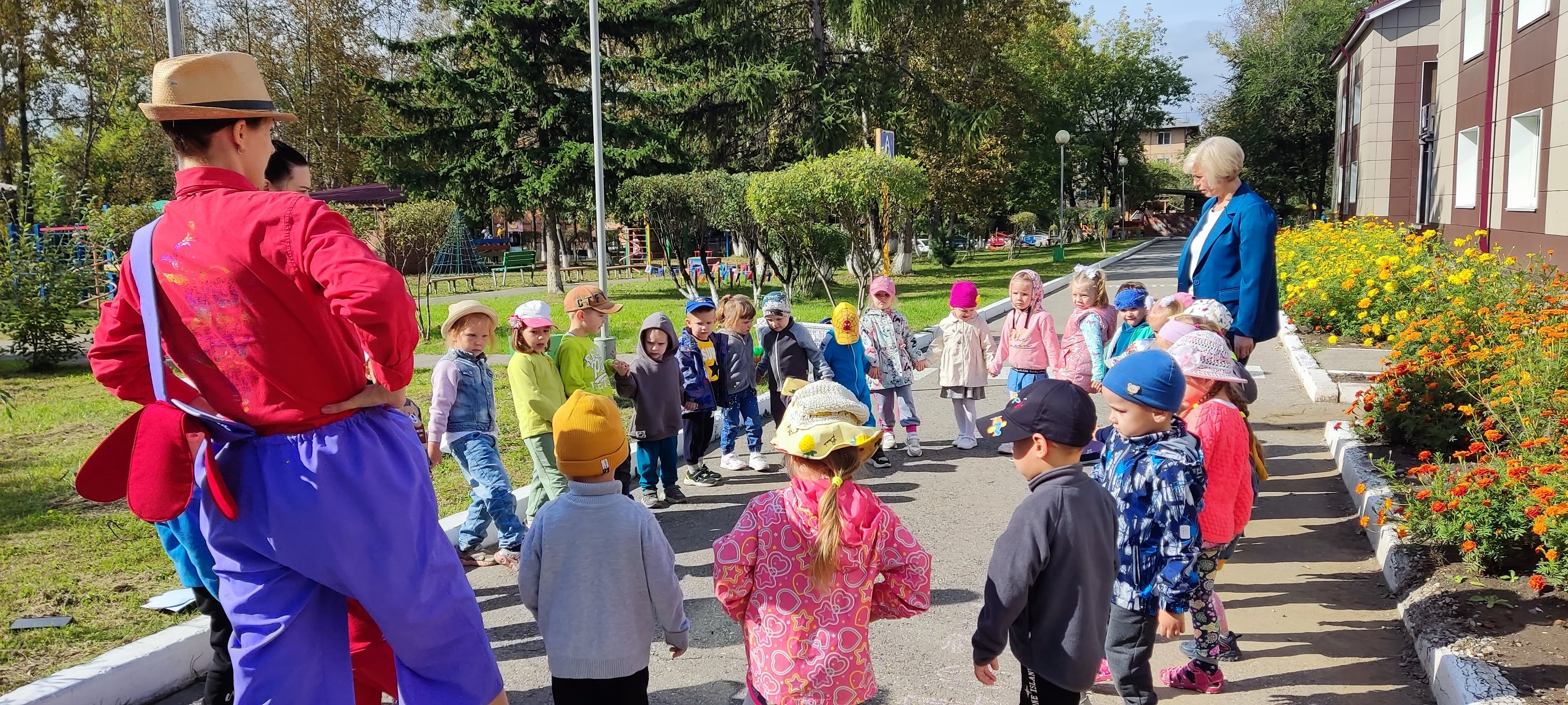 Ребят группы "Солнышки" пригласили на торжественную линейку, посвященную Дню Знаний, где был поднят старшими товарищами флаг России, прозвучал гимн и звонок.