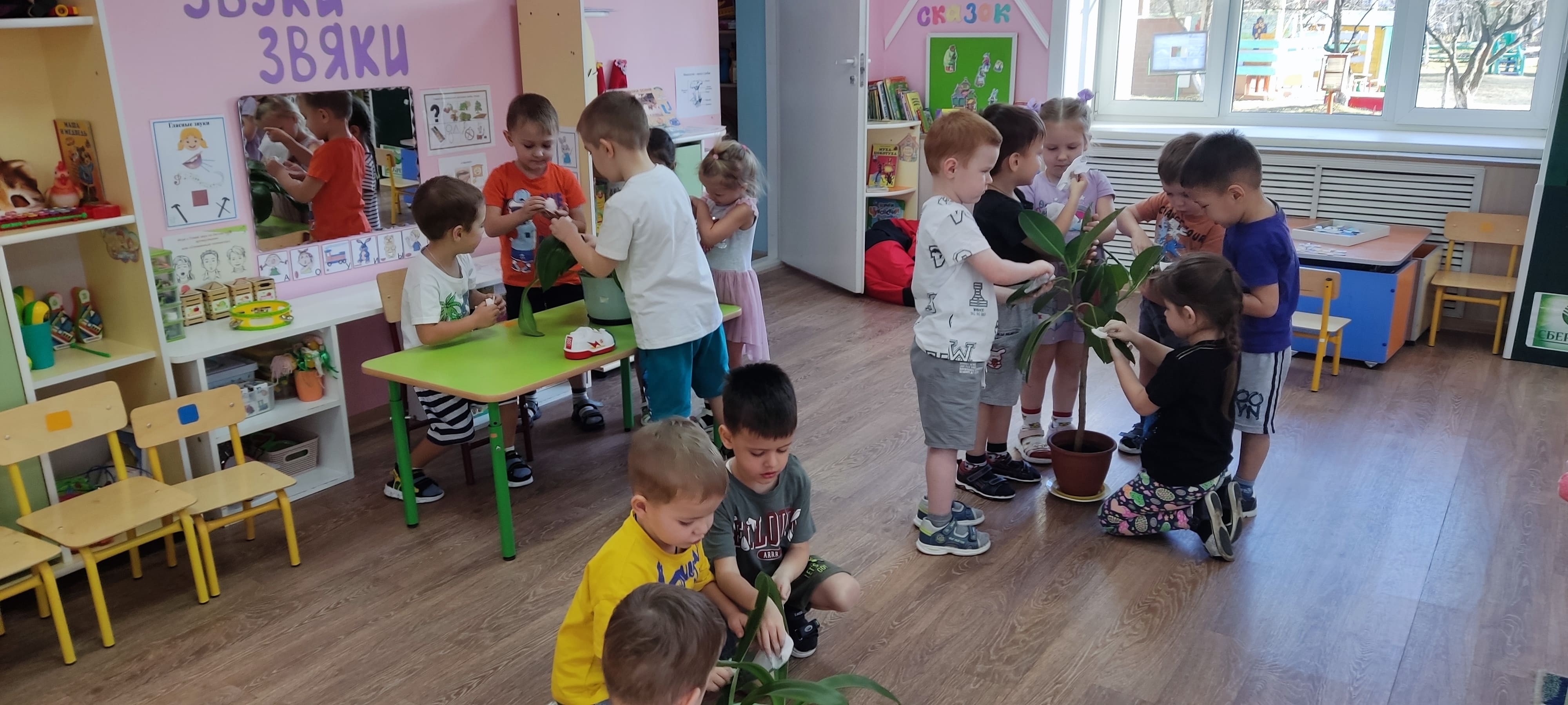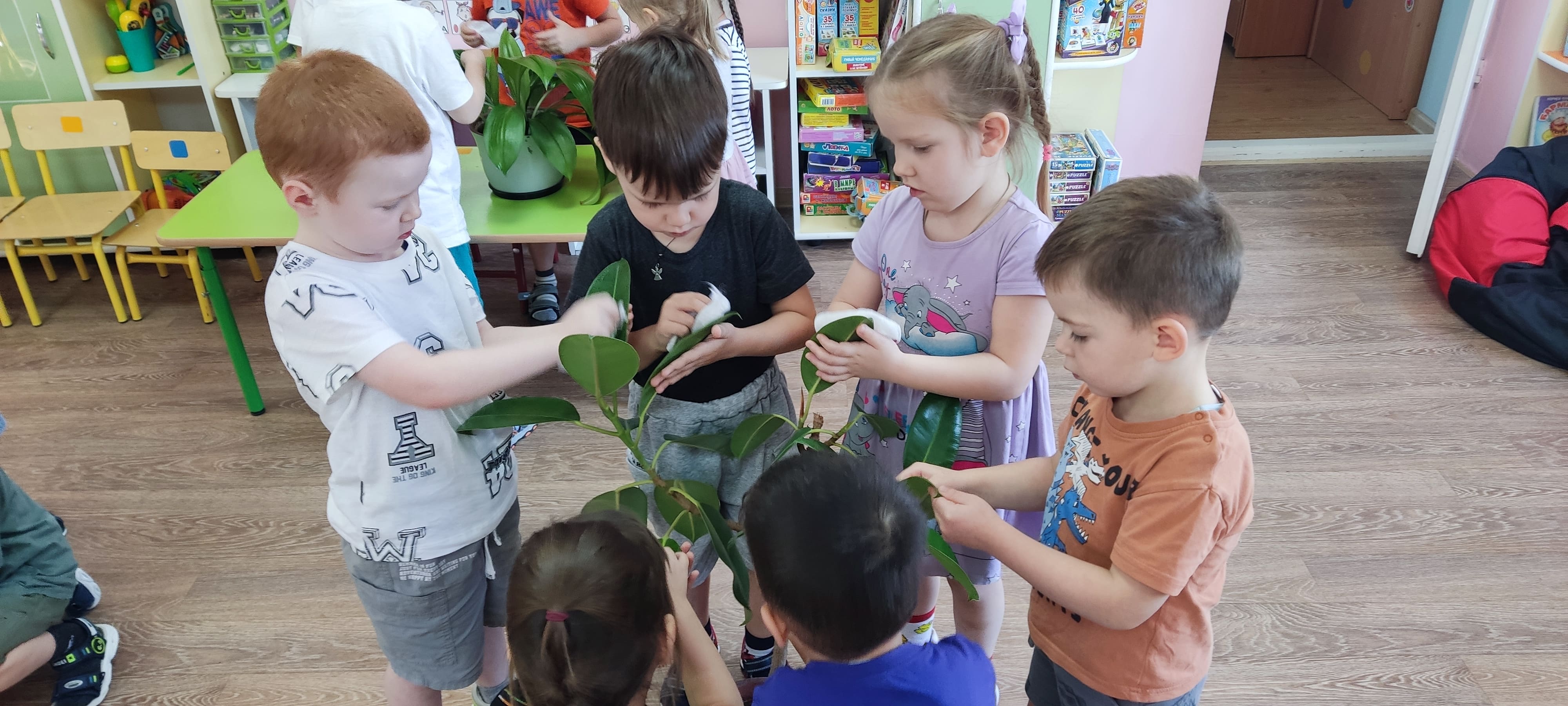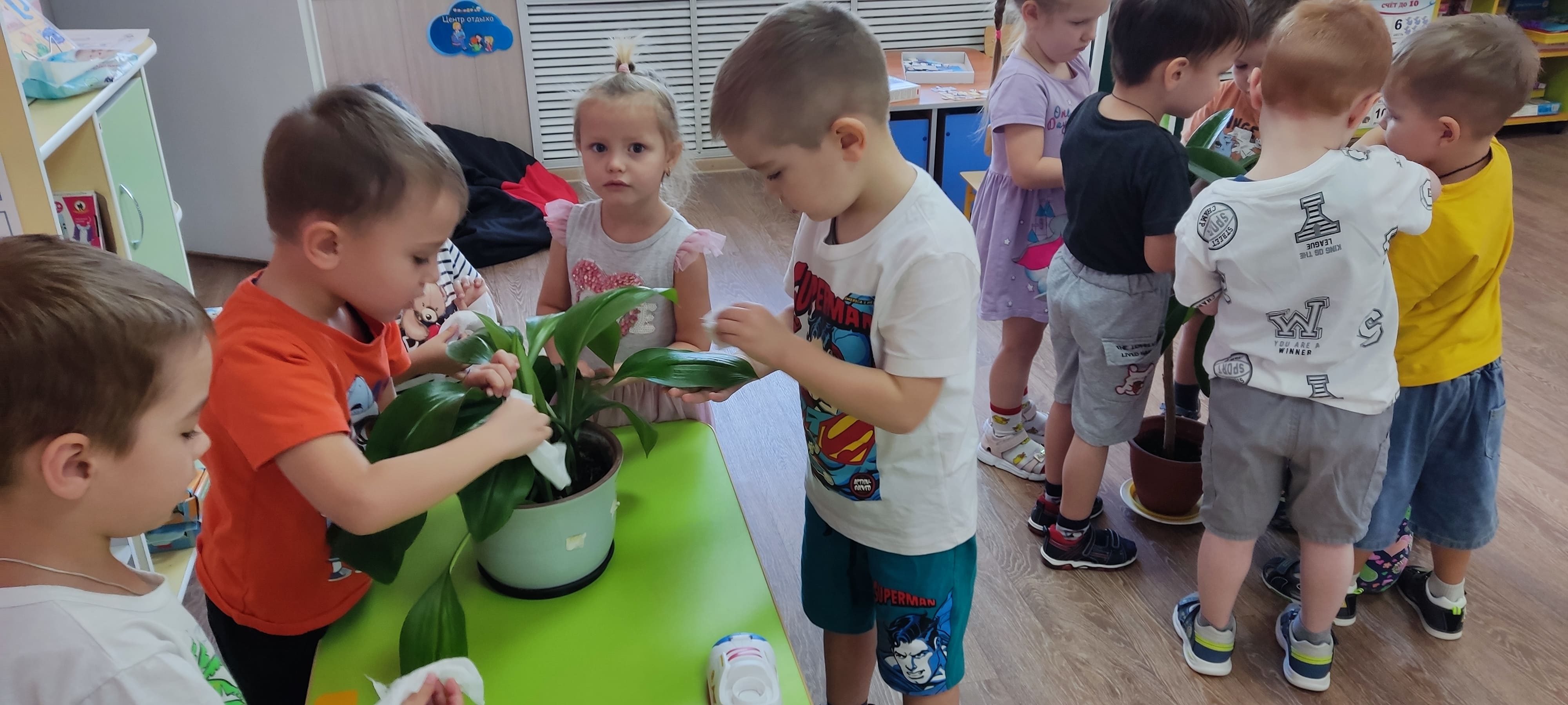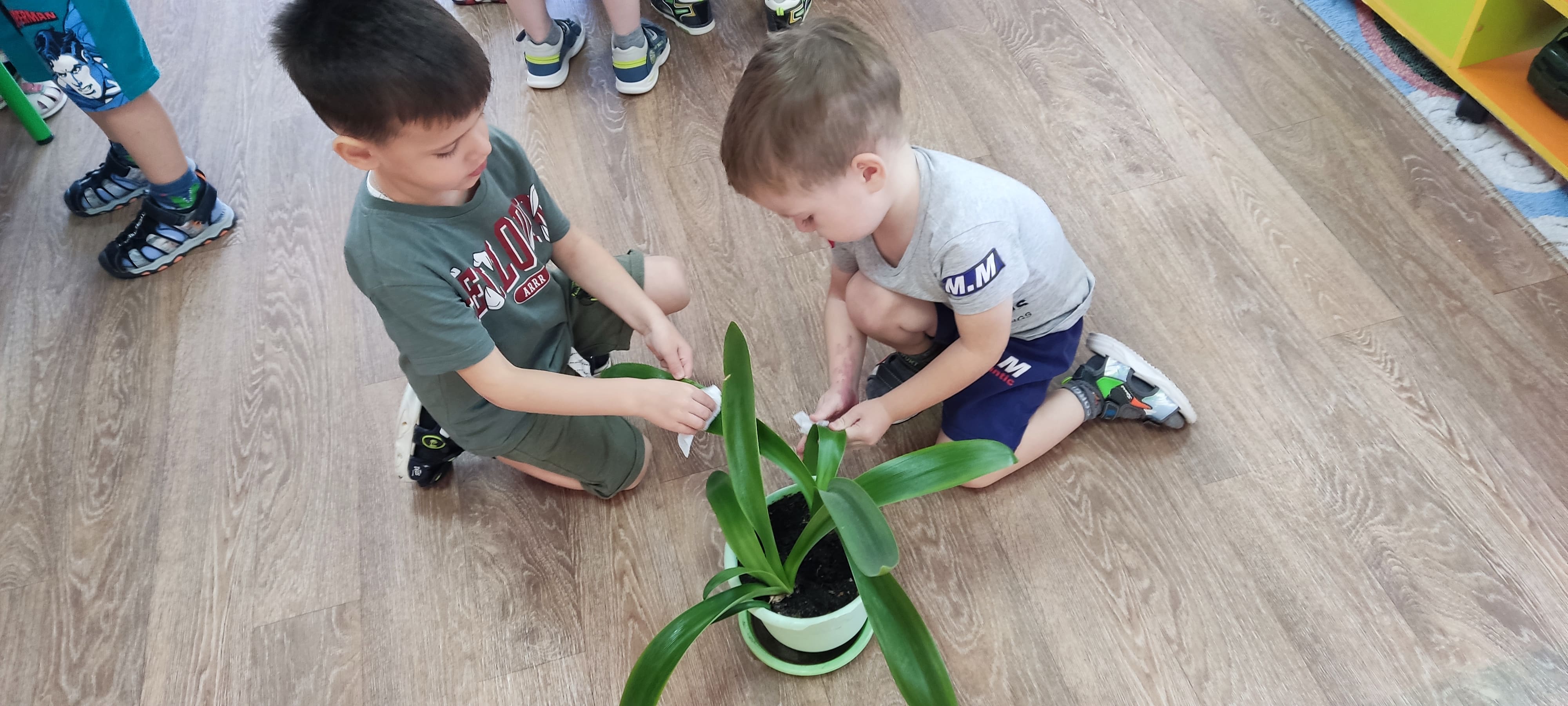 Ребята группы “Солнышки” - маленькие исследователи! Они самостоятельно выяснили разницу между сухой и влажной почвой, протерли листья растений.